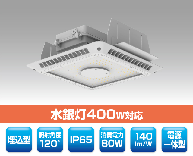キャノピー灯型LED照明(直付型) 最終更新日時 : ミヤデン キャノピー灯型LED照明 品番:YRS80W-GSCP-B-B 製品仕様 GS-CP series ● N:昼白色 YRS80W-GSCP-B-B/N 消費電力 : 80 W入力電圧 : AC 100 ~ 277 Vサイズ : 365.9 × 365.9 × 127.8 mm質量 : 6.87 kg設計寿命 : 50,000 h色温度 : ●N 5,000K演色性 : Ra80使用温度 : -40 ~ 50°C保護等級 : IP65照射角度 : 120°全光束参考値: ●N 11,200 lm雷サージ : 20 KV製品保証 : 5 年工事保証 : 6 ヶ月 製品仕様書 株式会社ユアーズ・トレード「製品情報」、https:www.yrstrade.com/prodacts、(参照 2025-12)
