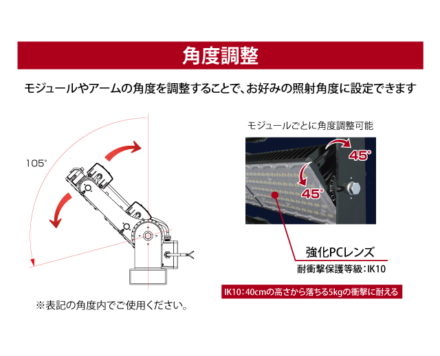 スポーツ施設向けLED投光器 最終更新日時 : ミヤデン LED投光器 品番:YRS1200W-CAR-B 製品仕様 CAR series ● N:昼白色 YRS1200W-CAR-B/N 消費電力 : 1200 W入力電圧 : AC 100 ~ 240 Vサイズ : 607 × 746 × 114 mm質量 : 22.5 kg設計寿命 : 50,000 h色温度 : ●N 5,000K演色性 : Ra70使用温度 : -40 ~ 50°C保護等級 : IP66照射角度 : 20° / 30° / 60° / 90° / 100 × 60°全光束参考値: ●N 192,000 lmフロントカバー: PCレンズ(IK10)雷サージ : 20 KV電源 : 一体型製品保証 : 5 年 製品仕様書 株式会社ユアーズ・トレード「製品情報」、https:www.yrstrade.com/prodacts、(参照 2025-11)