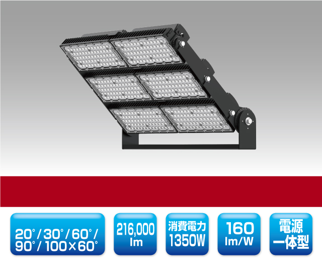 スポーツ施設向けLED投光器 最終更新日時 : ミヤデン LED投光器 品番:YRS1350W-CAR-B 製品仕様 CAR series ● N:昼白色 YRS1350W-CAR-B/N 消費電力 : 1350 W入力電圧 : AC 100 ~ 240 Vサイズ : 607 × 746 × 114 mm質量 : 22.5 kg設計寿命 : 50,000 h色温度 : ●N 5,000K演色性 : Ra70使用温度 : -40 ~ 50°C保護等級 : IP66照射角度 : 20° / 30° / 60° / 90° / 100 × 60°全光束参考値: ●N 216,000 lmフロントカバー: PCレンズ(IK10)雷サージ : 20 KV電源 : 一体型製品保証 : 5 年 製品仕様書 株式会社ユアーズ・トレード「製品情報」、https:www.yrstrade.com/prodacts、(参照 2025-11)