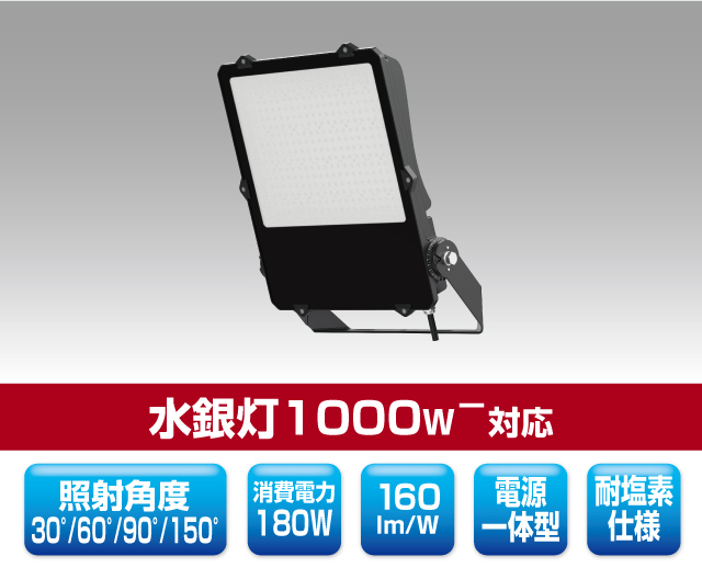 プール向けLED投光器 最終更新日時 : ミヤデン LED投光器 品番:YRS180W-SBP-B2-CRP 製品仕様 SBP-CRP series ● N:昼白色 YRS180W-SBP-B2/N-CRP 消費電力 : 180 W入力電圧 : AC 100 ~ 240 Vサイズ : 438 × 363 × 146 mm質量 : 4.82 kg設計寿命 : 50,000 h色温度 : ●N 5,000K演色性 : Ra80使用温度 : -40 ~ 50°C保護等級 : IP66照射角度 : 30° / 60° / 90° / 150°全光束参考値: ●N 28,000 lmフロントカバー: 乳白カバー(強化ガラス IK08)電源 : 一体型製品保証 : 3 年 製品仕様書 株式会社ユアーズ・トレード「製品情報」、https:www.yrstrade.com/prodacts、(参照 2025-11)