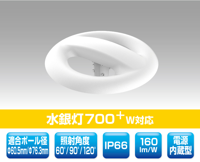 公園ポール灯対応LED照明 最終更新日時 : ミヤデン 公園ポール灯対応LED照明 品番:YRS150W-PKC-C 製品仕様 ● N:昼白色 YRS150W-PKC-C/N 消費電力 : 150 W入力電圧 : AC 100 ~ 240 Vサイズ : φ 380 × 162 mm質量 : 4.2 kg設計寿命 : 50,000 h色温度 : ●N 5,000K演色性 : Ra80使用温度 : -40 ~ 60°C保護等級 : IP66照射角度 : 60° / 90° / 120°全光束参考値: ●N 24,000 lm適合ポール径: φ 60.5 mm φ 76.3 mm製品保証 : 5 年 製品仕様書 株式会社ユアーズ・トレード「製品情報」、https:www.yrstrade.com/prodacts、(参照 2025-11)
