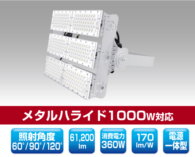 ミドルパワーモジュールタイプLED投光器 最終更新日時 : ミヤデン LED投光器 品番:YRS360W-MPMB-C 製品仕様 MP-M series ● N:昼白色 YRS360W-MPMB-C/N 消費電力 : 360 W入力電圧 : AC 100 ~ 240 Vサイズ : 485 × 340 × 324 mm質量 : 8 kg ±5 % ※電源含む設計寿命 : 50,000 h色温度 : ●N 5,000K演色性 : Ra70使用温度 : -40 ~ 60°C保護等級 : IP66照射角度 : 60° / 90° / 120°(乳白カバー)全光束参考値: ●N 61,200 lm雷サージ : 10 KV製品保証 : 5 年 製品仕様書 株式会社ユアーズ・トレード「製品情報」、https:www.yrstrade.com/prodacts、(参照 2025-11)