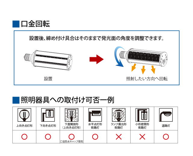 街路灯・道路灯対応LED電球 最終更新日時 : ミヤデン 街路灯・道路灯対応LED電球 品番:YRS40W-RB180-G 製品仕様 RB180 series ● N:昼白色 YRS40W-RB180-G/N 消費電力 : 40 W入力電圧 : AC 100 ~ 240 V入力電流 : 0.44 A / 100 V 0.22 A / 200V対応口金 : E39サイズ : 79 × 92 × 218 mm質量 : 760 g設計寿命 : 40,000 h色温度 : ●N 5,000K演色性 : Ra80使用温度 : -30 ~ 45°C保護等級 : IP64(口金部分除く)全光束参考値: ●N 6,000 lm ± 200 lm製品保証 : 5 年 製品仕様書 株式会社ユアーズ・トレード「製品情報」、https:www.yrstrade.com/prodacts、(参照 2025-11)
