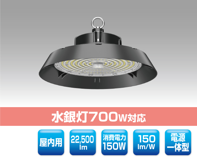 高天井用LED照明 最終更新日時 : ミヤデン 高天井用LED照明 品番:YRS150W-HBC-IS 製品仕様 HBC series ● N:昼白色 YRS150W-HBC-IS/N 消費電力 : 150 W入力電圧 : AC 100 ~ 240 Vサイズ : φ 306 × 122 mm質量 : 3.2 kg ※電源含む設計寿命 : 50,000 h色温度 : ●N 5,000K演色性 : Ra70使用温度 : -25 ~ 50°C保護等級 : IP65照射角度 : 60° / 90° / 120°全光束参考値: ●N 22,500 lm電源 : 一体型製品保証 : 5 年 製品仕様書 株式会社ユアーズ・トレード「製品情報」、https:www.yrstrade.com/prodacts、(参照 2025-11)